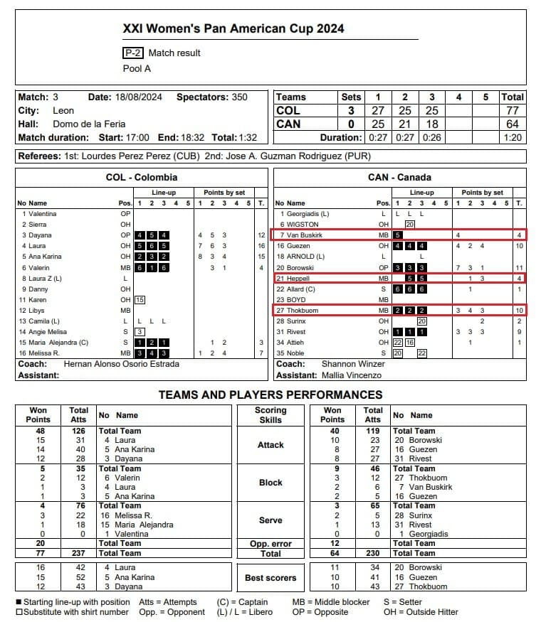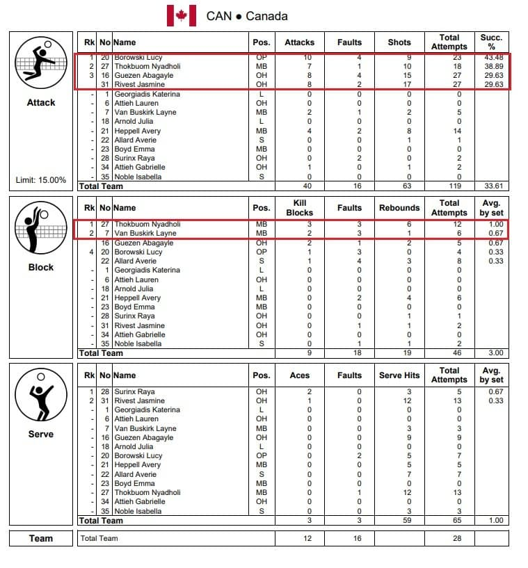 세부데이터를 보시면 더 잘 아시겠지만 미들블록커가 아웃사이드히터들과 점수 경쟁을 하고 있다는게 말이 안됩니다...캐나다는 2023년 MD들을 다시 기용하면서 수비에 신경을 썼는데 포인트를 뽑아줘야하는 어태커들이 전혀 힘을 쓰질 못합니다.