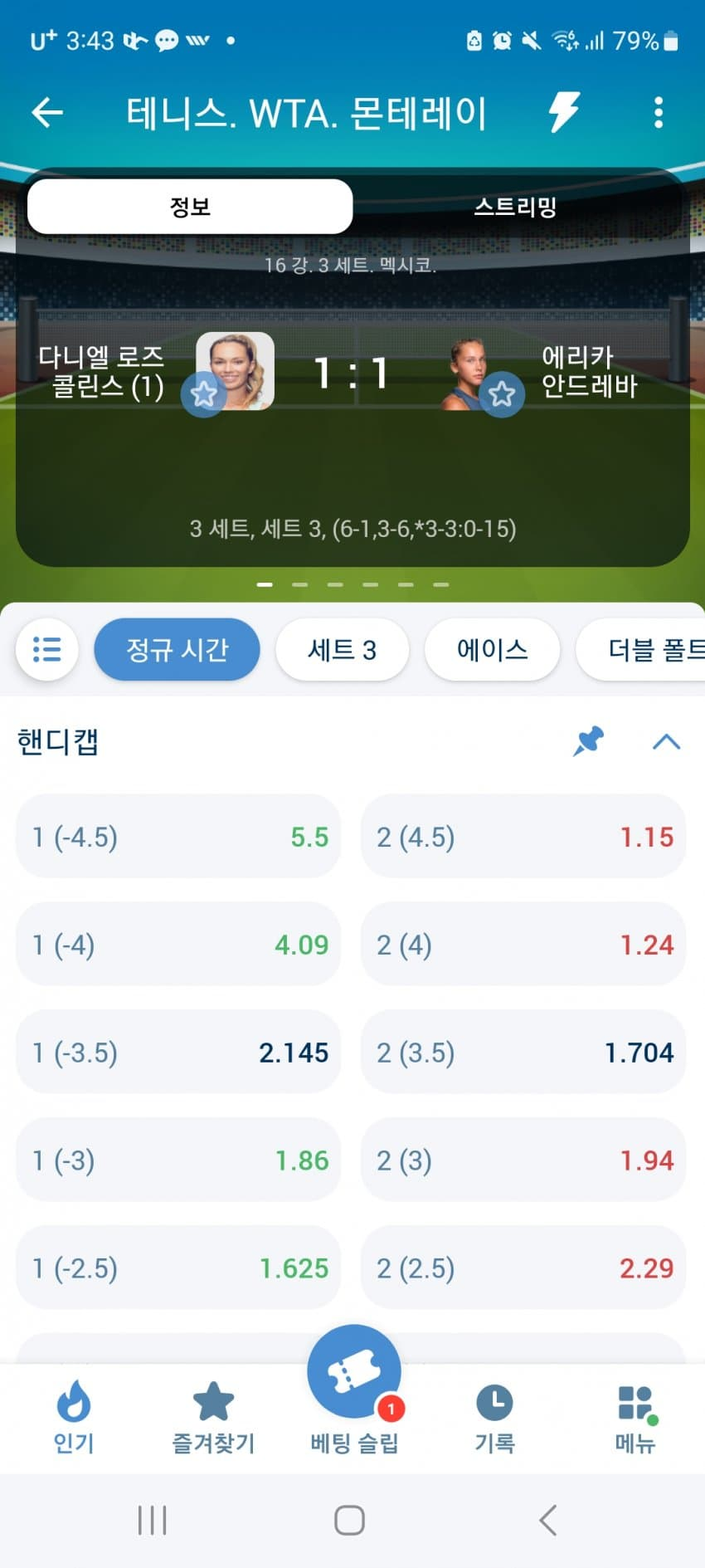 세트1때 압도적으로 로즈 콜린스가이겨서  에리카 실시간배당11이였는데  지금2배