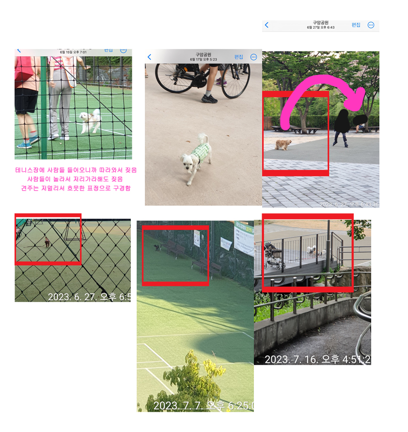 테니스장에서 목줄안하니 사람이 들어오면 짖으며 따라오는 경우도 있음. 사람들이 놀라서 저리가라해도 주인은 보고만 있는 경우가 대부분