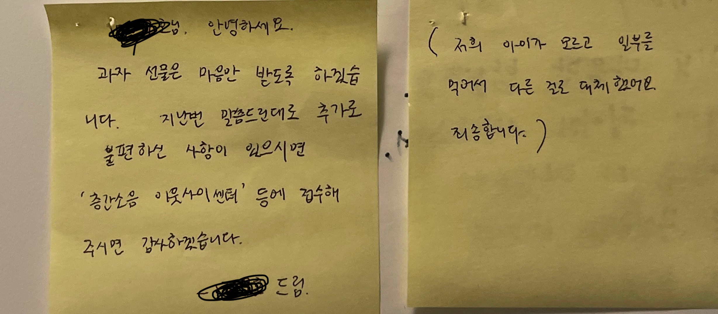 구입해서 윗 집 앞에 조용히 두고 출근했어요.