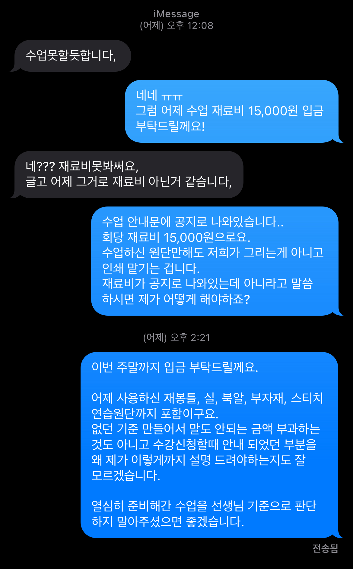 그리곤 다음날 재료비 안내차 전체 문자를 했더니,