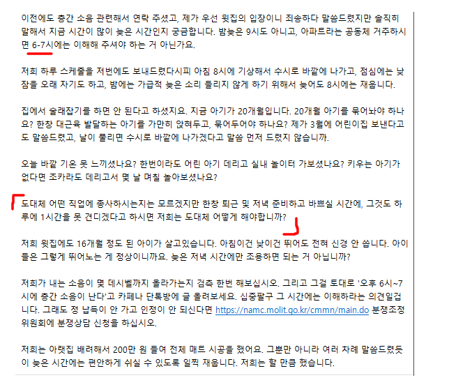 내용중에 6-7시 사이에 층간 소음은 이해해야 하는 거 아니냐는 댓글을 달음