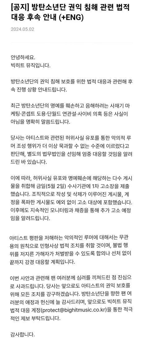 0502 고소진행 1차 진행상황 알림 알엠 진 슈가 제이홉 지민 뷔 정국