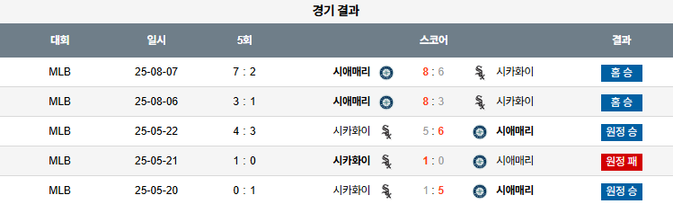 이번 경기는 선발 투수의 안정감과 경기 운영의 완성도에서 시애틀이 확실한 우위를 점하고 있다. 로건 길버트는 초반 흐름을 주도하는 능력이 탁월하며, 중심타선의 응집력과 하위 타순의 생산성까지 겸비한 시애틀 타선은 다양한 득점 루트를 가지고 있다. 불펜 역시 리그 상위권 수준의 운영을 보여주고 있어, 초반 리드를 잡을 경우 경기 전체를 안정적으로 이끌어갈 가능성이 높다. 반면 화이트삭스는 선발 스미스의 경험 부족과 불펜·수비 전력의 불안정성이 치명적인 약점이다. 전체적인 팀 밸런스에서 시애틀이 압도적이다.