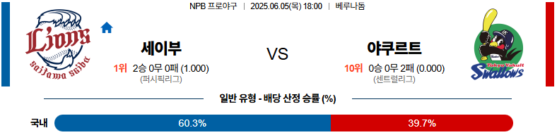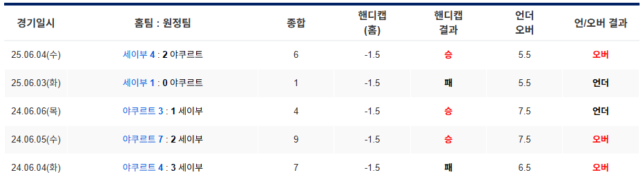 반면 야쿠르트는 원정 경기의 고질적인 약세와 아빌라의 돔 구장 부진이 겹쳐 반등 가능성이 낮음.