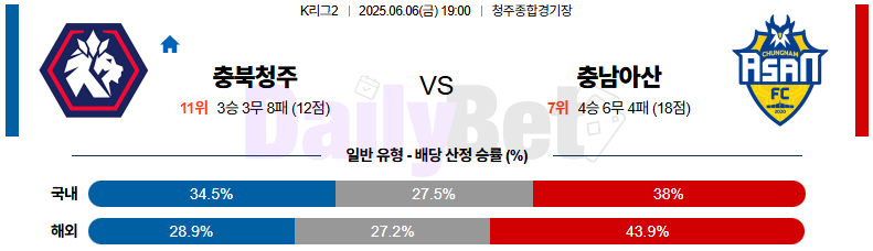 축구 06월 06일 K리그 2 충북청주 vs 충남아산