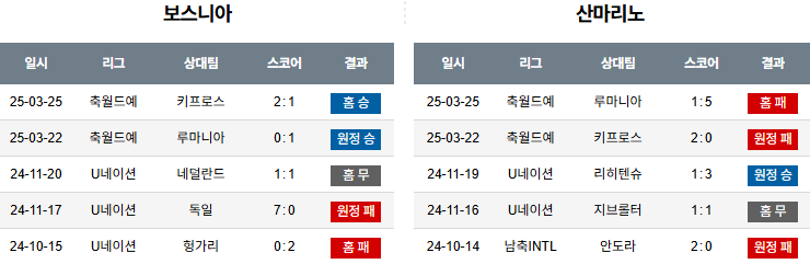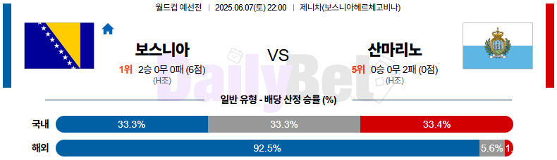 “박스투박스 중원의 유기적 전개와 세컨드볼 장악에 강점을 보이는 보스니아가 수비 집중력 부족한 산마리노를 몰아붙일 경기 흐름 예상”