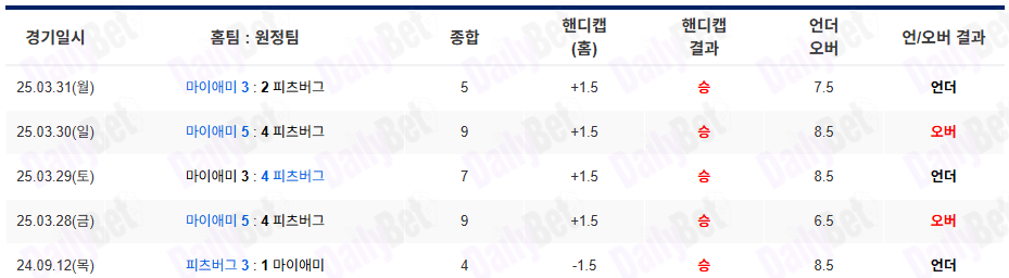 특히 접전에서 마이애미의 불펜은 흔들리는 반면, 피츠버그는 최근 1점차 승부를 잘 지켜내고 있음.