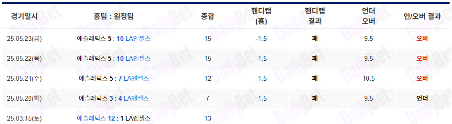 좌완 상대로 양 팀 모두 약세를 보이고 있지만, 애슬레틱스는 에인절스 원정이라는 환경에서 장타력 발휘가 쉽지 않다.