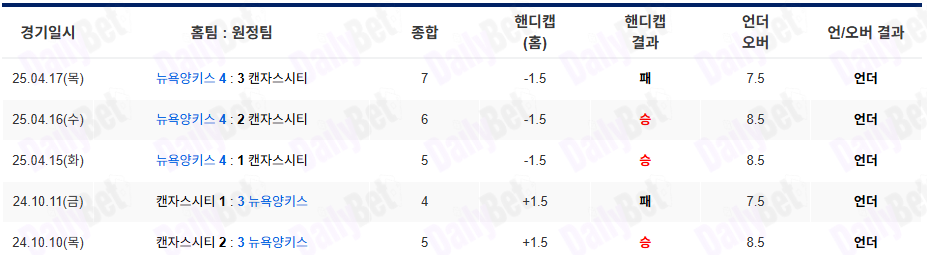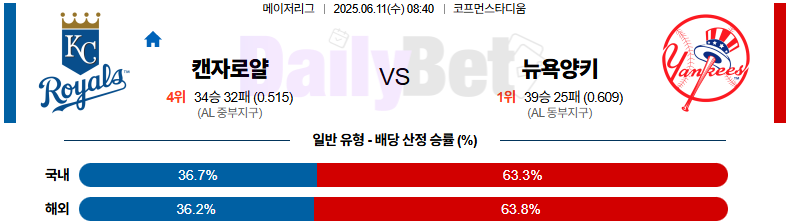 최근 캔자스 불펜 불안과 득점 효율 문제를 감안하면, 양키스가 한두 번의 기회를 살려 신승할 확률이 높음.