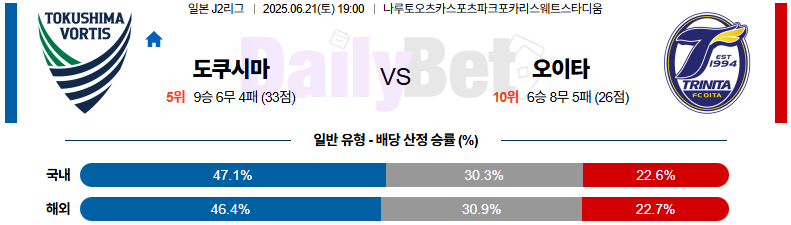 도쿠시마는 볼이 위치한 지역에 수적 우위를 형성해 점유율을 장악하고, 박스 근처에서 볼 회전과 침투 플레이를 완성도 높게 구사하는 팀. 반면 오이타는 빠른 전환을 선호하지만 박스 근처 마무리 능력과 압박 탈출 능력에서 반복적인 한계를 보이고 있어 경기 흐름 전체가 도쿠시마에게 유리하게 전개될 가능성이 크다.