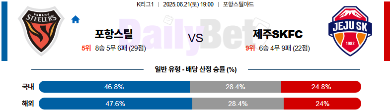 ✅ 전술 일관성과 홈 경기 준비도에서 포항 우위. 제주는 이동 피로+집중력 저하가 변수.